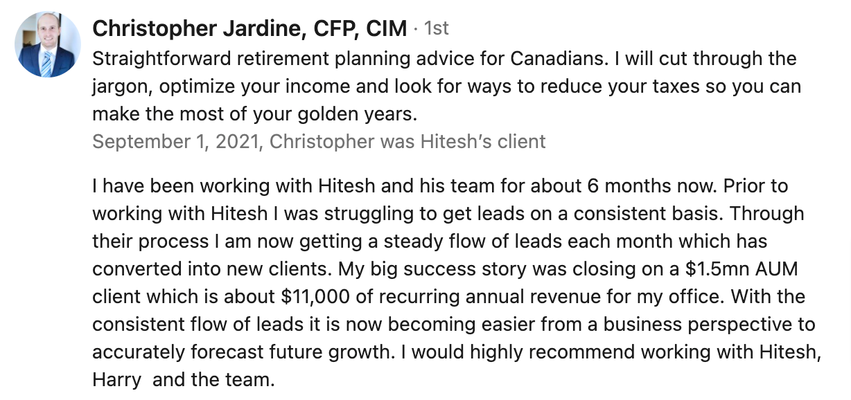 Currently I’m helping Financial Advisors add $60M - $200M in new managed assets to their pipeline guaranteed.